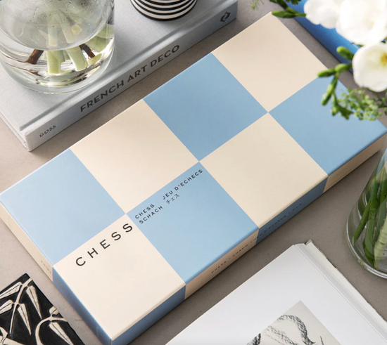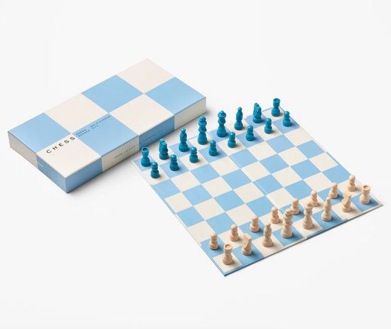 Our Play - Chess showcases a beautiful sky blue palette, adding a touch of playful color to any home interior. The set includes a 10x10 inches foldable chessboard made of cardboard and wooden pieces in blue and beige - making it the perfect companion for chess enthusiasts on the go.