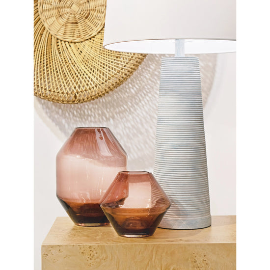 The Sofia vases are made from colored glass in a beautiful bordeaux hue. Each vase features a unique geometric shape, so they can be displayed together or individually.